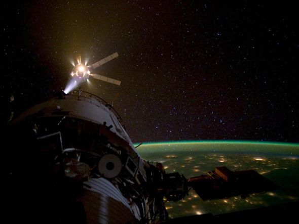一艘飞船的推进器发出的亮光与地球上的城市灯光相映成辉,这张照片是3月28日在国际空间站上拍摄的。宇航员丹-贝蒂在自动货运飞船“爱德华多-阿玛尔迪”号(Edoardo Amaldi)慢慢靠近空间站,准备对接时捕捉到这一画面。在与空间站对接期间,该飞船将通过一系列再推进操作,重新点燃推进器,以便让该站呆在理想的轨道里。推进器还可用来移动空间站,防止被太空垃圾撞到。