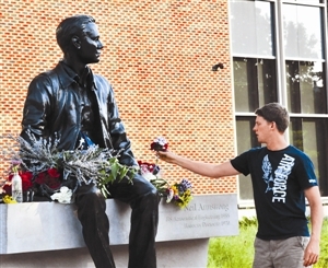 8月25日,在美国印第安纳州普渡大学以尼尔·阿姆斯特朗的名字命名的工程学院前,一名学生向阿姆斯特朗雕像献花。