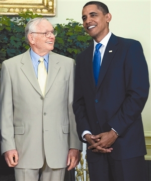 2009年7月20日,阿姆斯特朗(左)与总统奥巴马在华盛顿参加登月40周年庆祝活动。