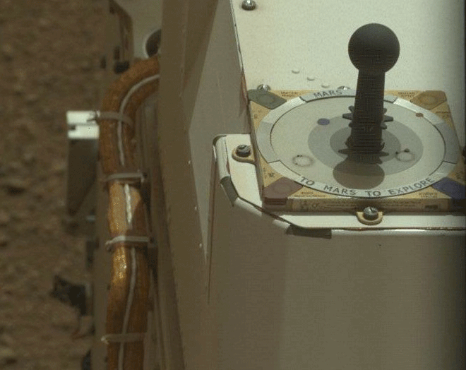 一段8分钟的延时视频,展示了“好奇”号日晷上的影子移动。一个微小的黑色球形捏手形装置从“好奇”号右后侧伸出,这个装置就是“好奇”号的日晷。日晷是此前的火星任务——“机遇”号和“勇气”号的遗产,上面有16种语言写的“火星”字样。除了帮助确定时间外,这个仪器还可用于校准“好奇”号的高分辨率3D彩色桅杆相机。火星的多尘环境让一切景象看起来都比地球上的红一些,照相机需要了解哪些色彩是真实存在的。日冕上的红色、蓝色、黄色和绿色带帮助照相机判断周围的色彩。此外,日冕上还刻有文字“To Mars,To Explore”(意为探索火星),在“好奇”号“死亡”后充当一个纪念碑。