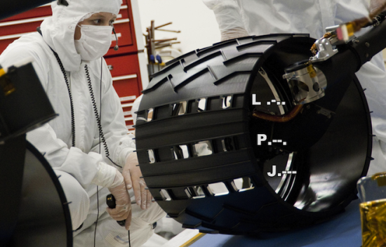 “好奇”号车轮一个最令人吃惊的设计是每个车轮上有3排小孔,形状为字母J-P-L,代表喷气推进实验室