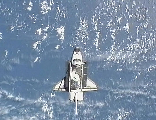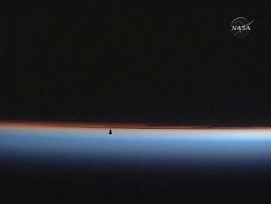 在地球色彩斑斓的地平线之上,“奋进”号的剪影被勾勒出来