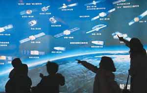 四月二十二日,参观者在位于山东烟台的中国航天五一三研究所观看 “卫星飞船型谱图”。唐 克摄(人民视觉)